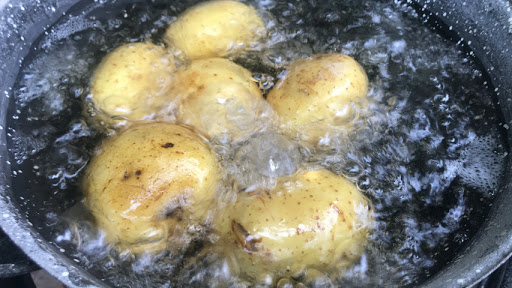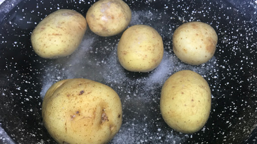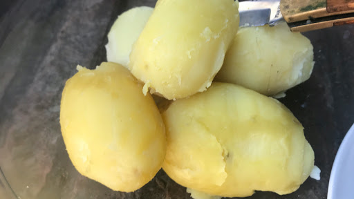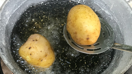 En una olla con abundante agua muy sazonada cuece las patatas hasta que al pincharlas estén blandas. El tiempo dependerá del tamaño de la patata y otros factores. Pela las patatas y reserva.