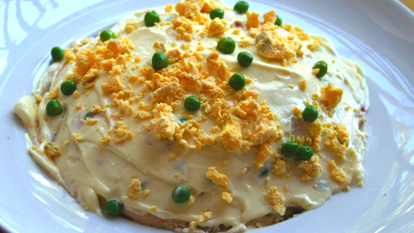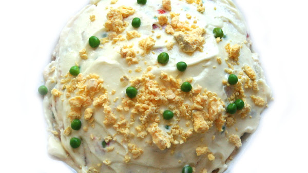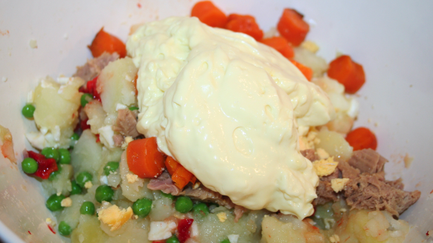 Sirve en una fuente y decora cubriendo en primer lugar con una capa de mahonesa y después con la yema, guisantes, pimientos... lo que gustes.