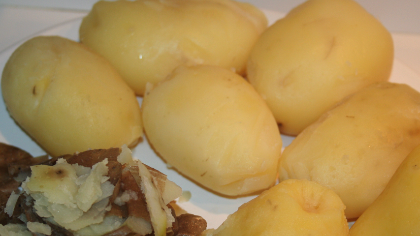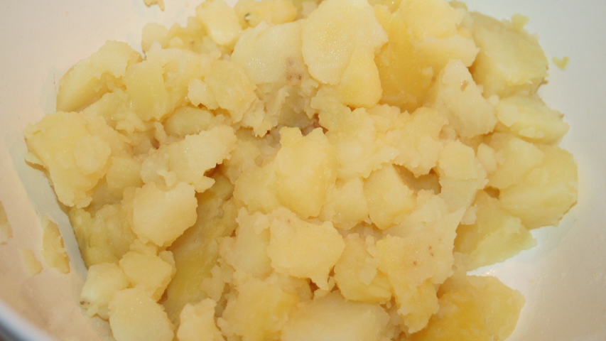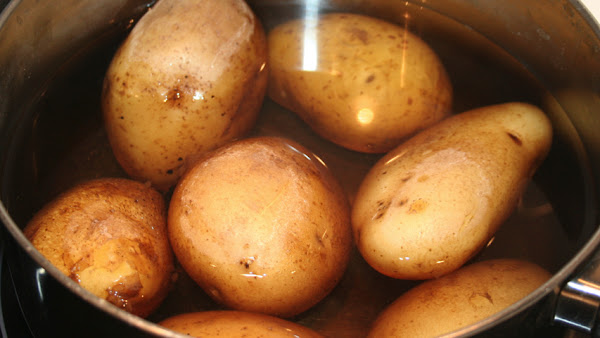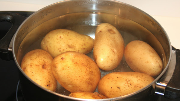 Prepara una olla a fuego alto y con agua abundante para cocer las patatas. Añado sal abundante. El hervor debe ser suave y las patatas deben cocer hasta que al pincharlas estén tiernas. Después apago el fuego y dejo que las patatas se atemperen dentro de la olla. Una vez atemperadas las pelo y las troceo groseramente dentro de un bol grande en el que haré la mezcla de la ensaladilla.