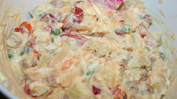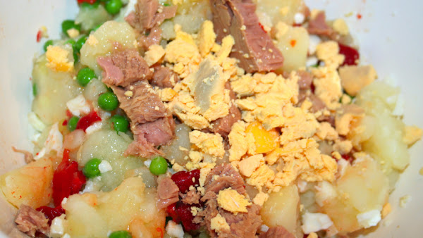 En el bol voy añadiendo y mezclando los diferentes ingredientes en la cantidad que guste y reservando yema de huevo, guisantes, pimientos... para decorar.