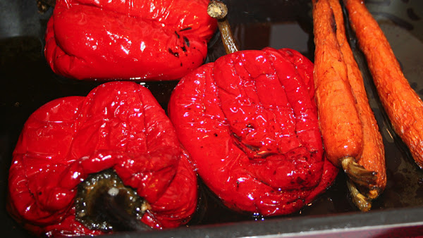 En una bandeja de horno coloco el pimiento rojo y la zanahoria bien limpios. Añado sal y aceite de oliva y cubro con un papel de aluminio. Introduzco esta bandeja en el horno a 200º C (392º F) durante media hora. Después apago el fuego y dejo que atemperen en el horno cubiertos con el papel de aluminio. Una vez atemperados retiro el pedúnculo de los pimientos, las semillas y la piel. Troceo la pulpa del pimiento y las zanahorias. Reservo.