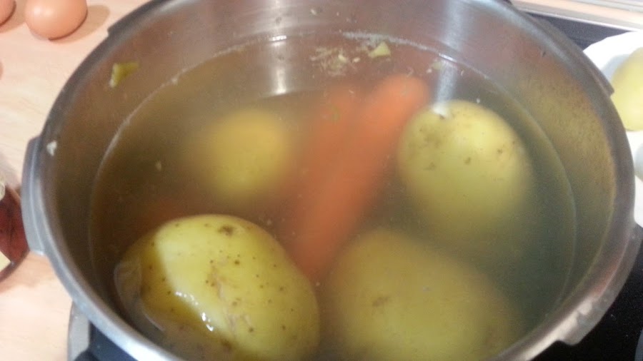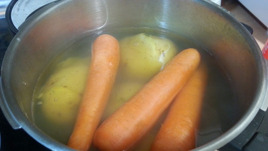 ponemos agua en una cazuela y llevamos las patatas y zanahorias a ebullicion con la piel y todo hasta que esten tiernas