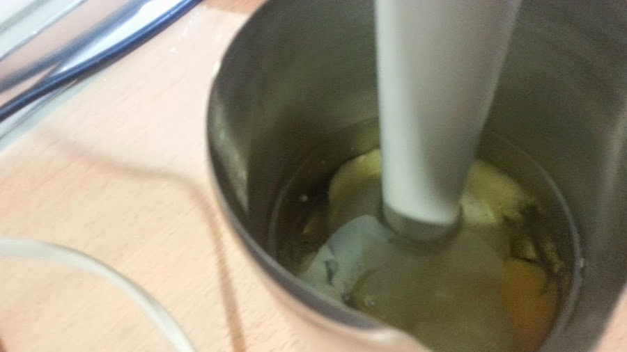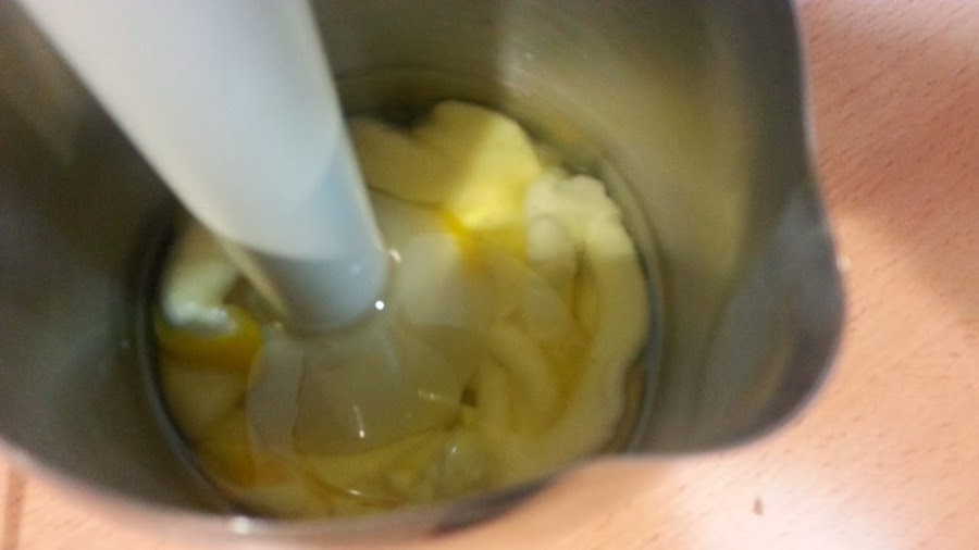 La batidora sigue en el fondo sin moverse y ya veréis como se forma la mahonesa y desaparece el aceite, cuando eso pase, ya podéis subir hacia arriba y abajo la batidora e incluso si queréis subir un poco la velocidad