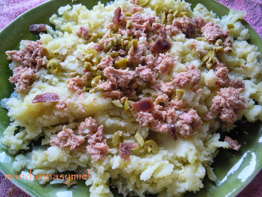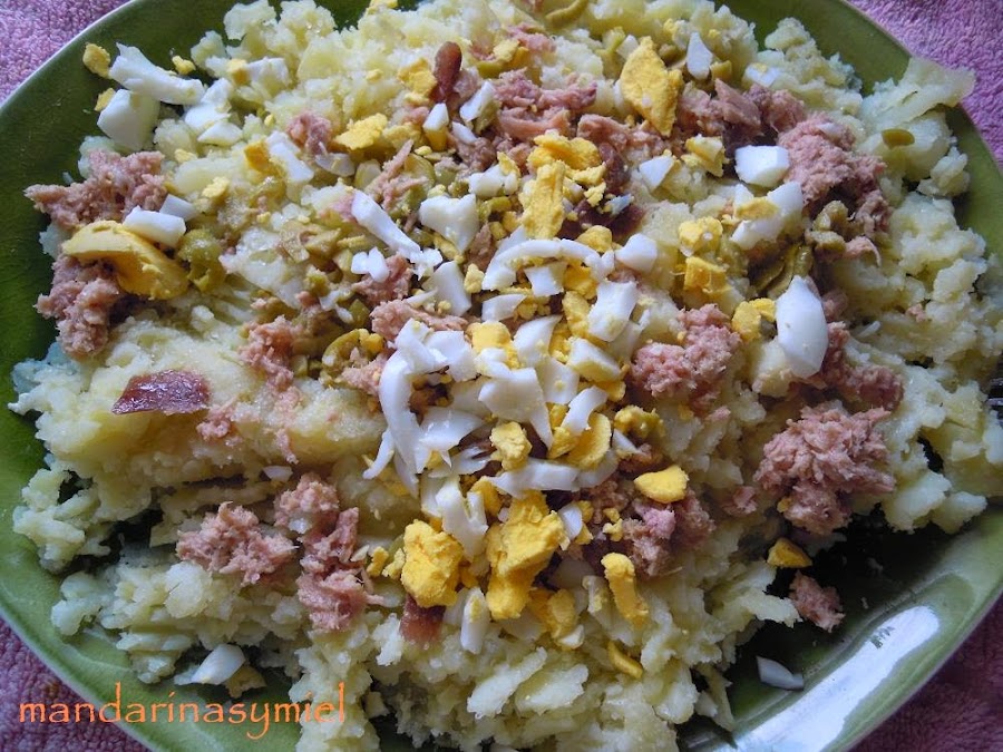 Pon encima de la patata picada todos los ingredientes troceados, mezcla bien todo y añade el atún (no pongas el aceite de la lata). Pon un poco de mahonesa con una cuchara y mezcla.