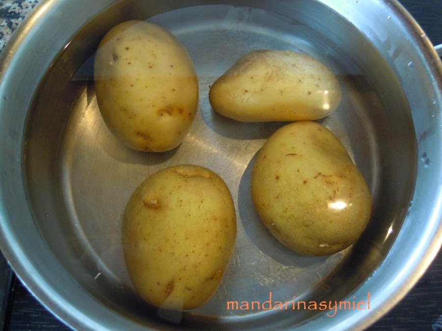 Lava las patatas y ponlas a hervir sin pelar, déjalas cocer hasta que estén tiernas. Escúrrelas del agua y deja que se enfríen, luego quítales la piel y las picas en una fuente con un tenedor, ponle la sal.