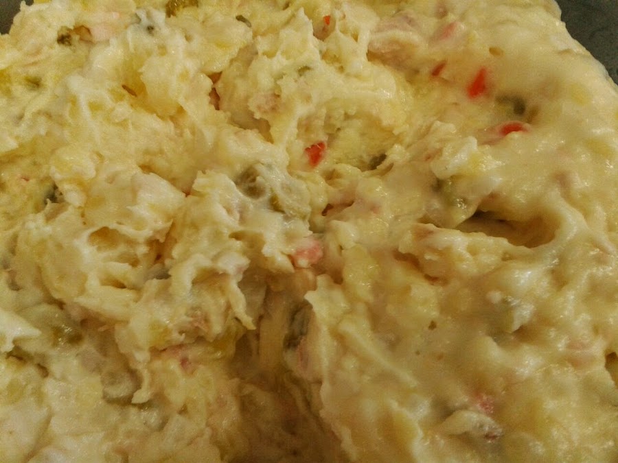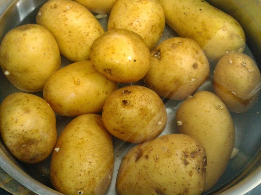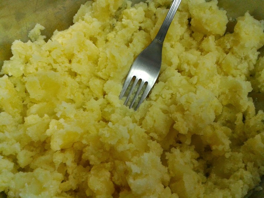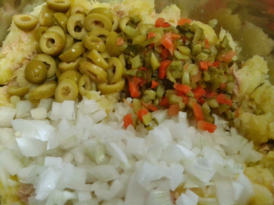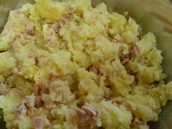 Comprobamos que están bien cocidas pinchándolas con un cuchillo y las escurrimos. Tras esperar un buen rato a que se enfríen las pelamos y trituramos con un tenedor en un recipiente amplio. Es importante que quede en partes desiguales para la textura de nuestra ensaladilla.