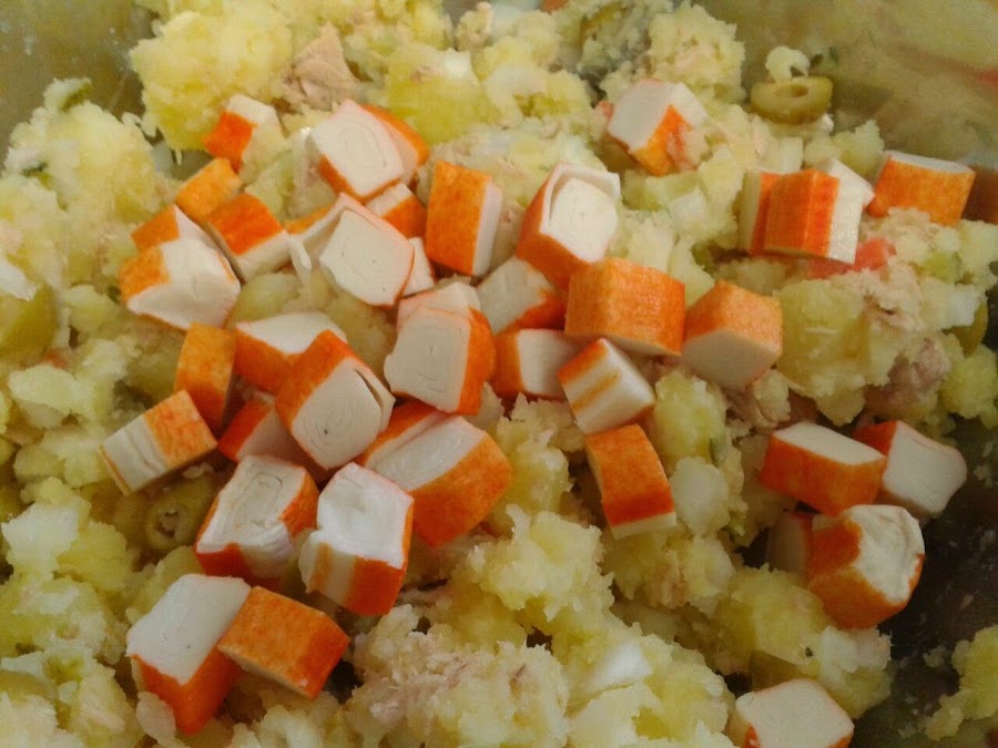 Removemos bien el conjunto y agregamos los palitos de cangrejo cortados.