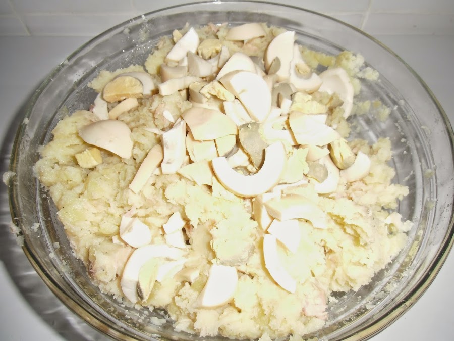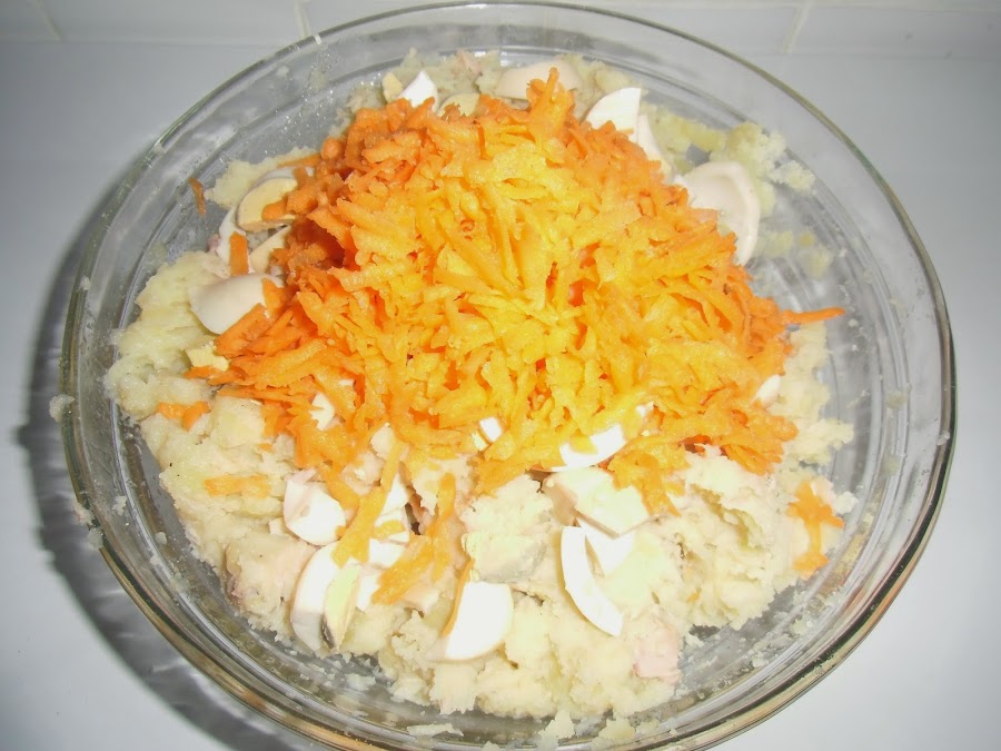 Pelamos, cortamos 4 huevos y se los añadimos también.