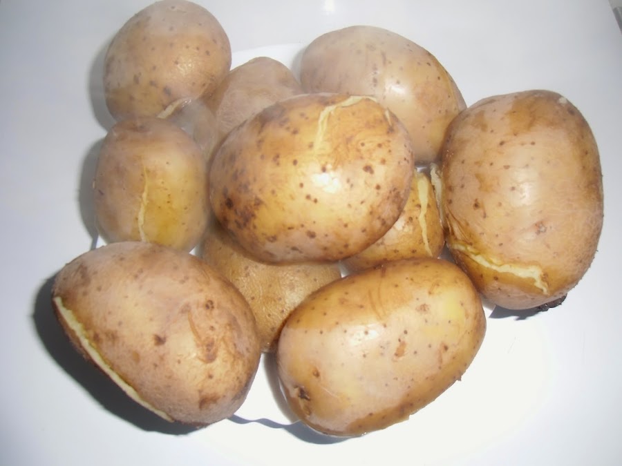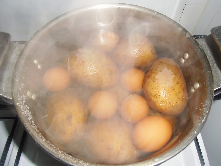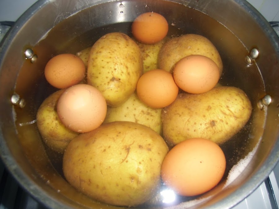 AguaLavamos las patatas y las metemos en una olla con agua y un puñado de sal y los huevos.