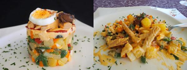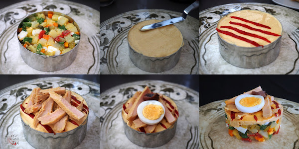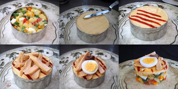 Llenamos el aro con la mezcla y la compactamos ligeramente. Incorporamos dos o tres cucharadas de mayonesa de pimentón. Adornamos con unas tiras de pimiento, ponemos los lomos de atún encima y acabamos con una rodaja de huevo y una anchoa enrollada. Podemos acabar espolvoreando en el plato un poco de perejil picado y pimentón.