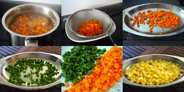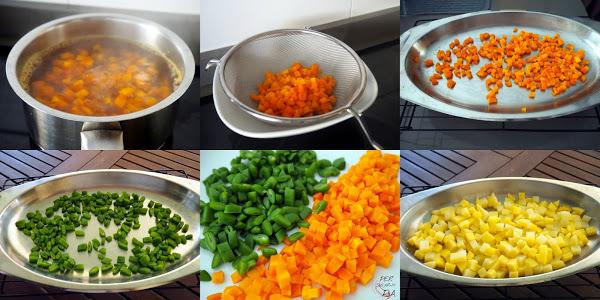 Cocer las verduras por separado para que todas queden en su punto, cocidas pero firmes, no deshechas vamos. Además mantendrán mejor el color, la textura y el sabor. Escurrir y dejar enfriar por separado. Una opción para ganar tiempo, y romper la cocción por el calor residual, es extenderlas sobre una bandeja.