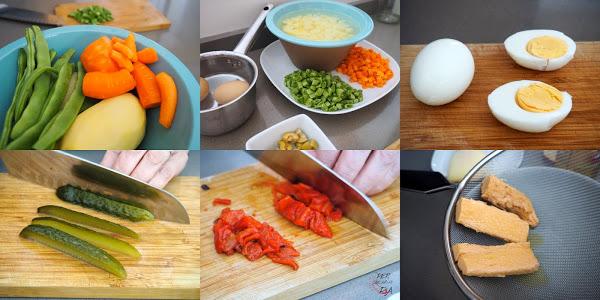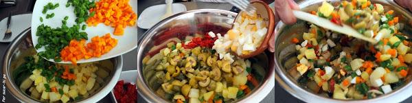Colocar las patatas, las judías y la zanahoria en un bol. Añadirlos pimientos, las olivas, los pepinillos y el huevo duro. Mezclar suavemente todos los ingredientes y reservar en la nevera.