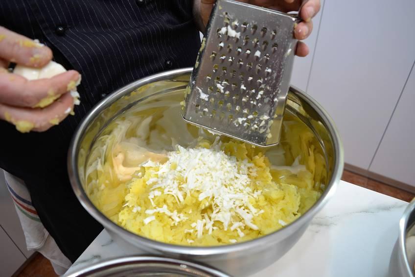 Paso 1 Si no tenéis patatas y huevos cocidos, lo primero que tenéis que hacer es cocerlos. Una vez cocidos y pelados, rallamos tanto la patata como el huevo en un bol de buen tamaño en el que nos quepa toda la ensaladilla y podamos trabajar con comodidad.
