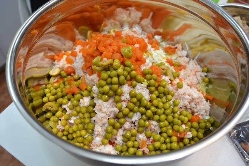 Paso 2 Después picamos los palitos de sucedáneo de cangrejo y luego hacemos lo mismo con los langostinos. Una vez picado todo, lo añadimos al bol. Lo siguiente que pondremos son los guisantes y las zanahorias baby de IBSA, estas últimas picaditas también.