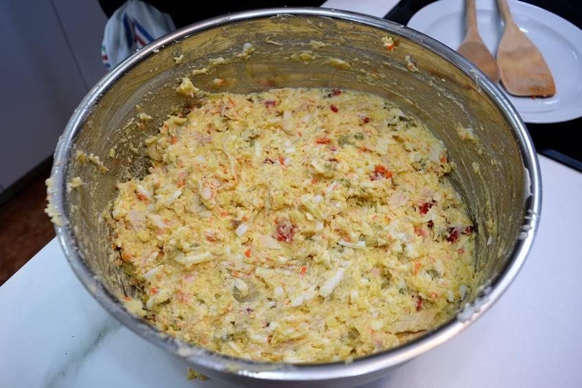 Paso 3 Seguimos picando y añadiendo las aceitunas verdes rellenas de anchoa. Después cortamos en trocitos los pimientos asados en conserva de IBSA, desmigamos el atún, lo añadimos todo al bol y finalmente ponemos un buen chorro de vinagre y mayonesa abundante. Removemos para mezclarlo todo perfectamente y nos disponemos a montar un plato.