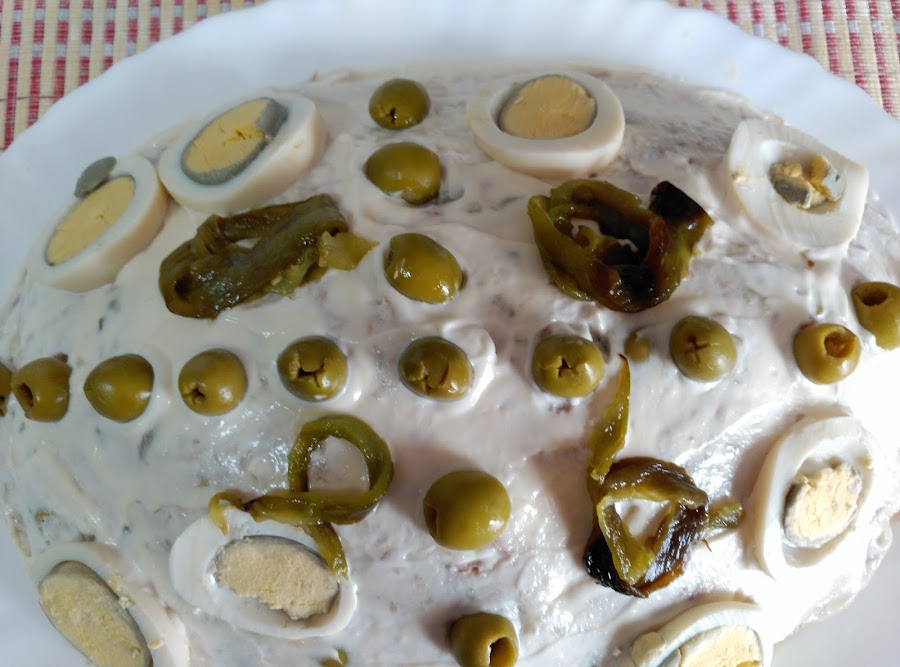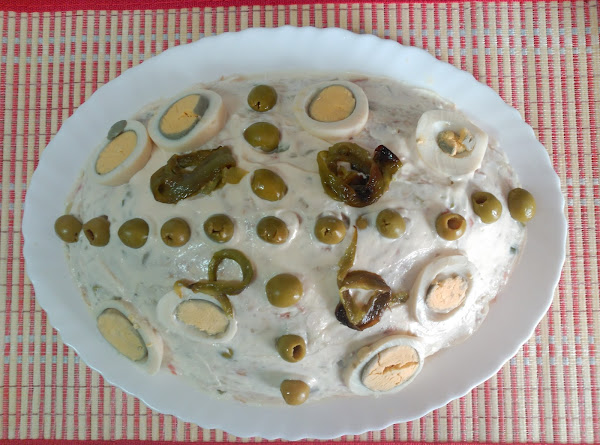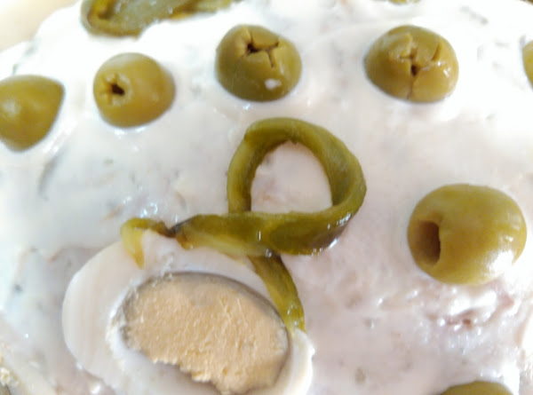 Ponlo todo en una fuente y alisa la superficie. Cubre con un poco mas de mayonesa y alisa. Adorna con el huevo duro, el pimiento y las aceitunas restantes.