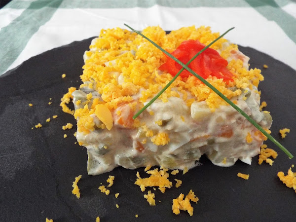 Cuando las verduras estén fría, las mezclamos con la mahonesa, los pepinillos, las olivas, el atún que lo escurriremos bien, y las claras de los huevos, las yemas las reservaremos para decorar.