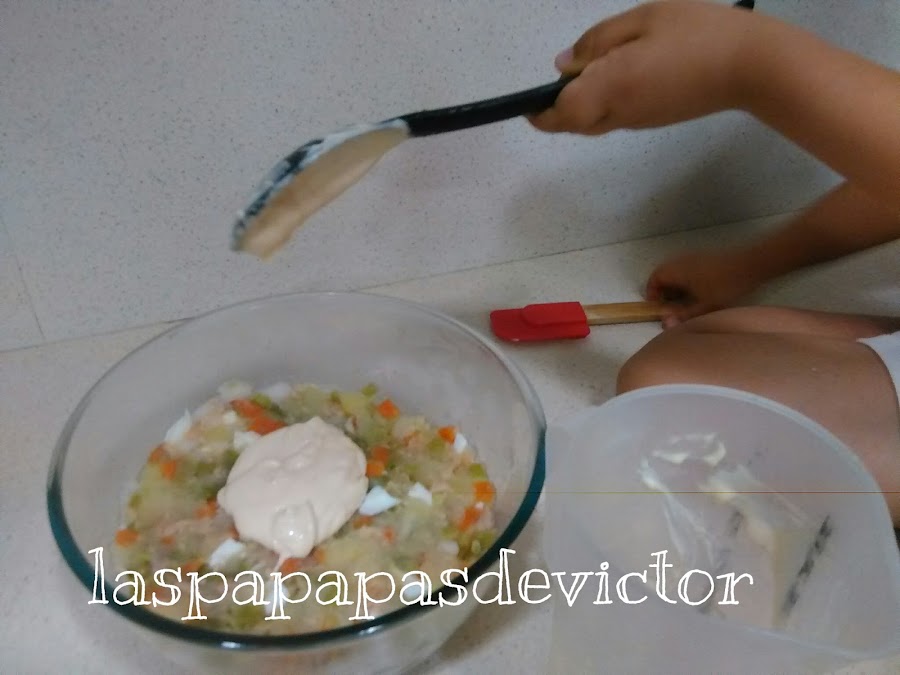 Cuando esté todo en su punto escurrir y poner en un bol todas las verduras y añadir los guisantes y el atún