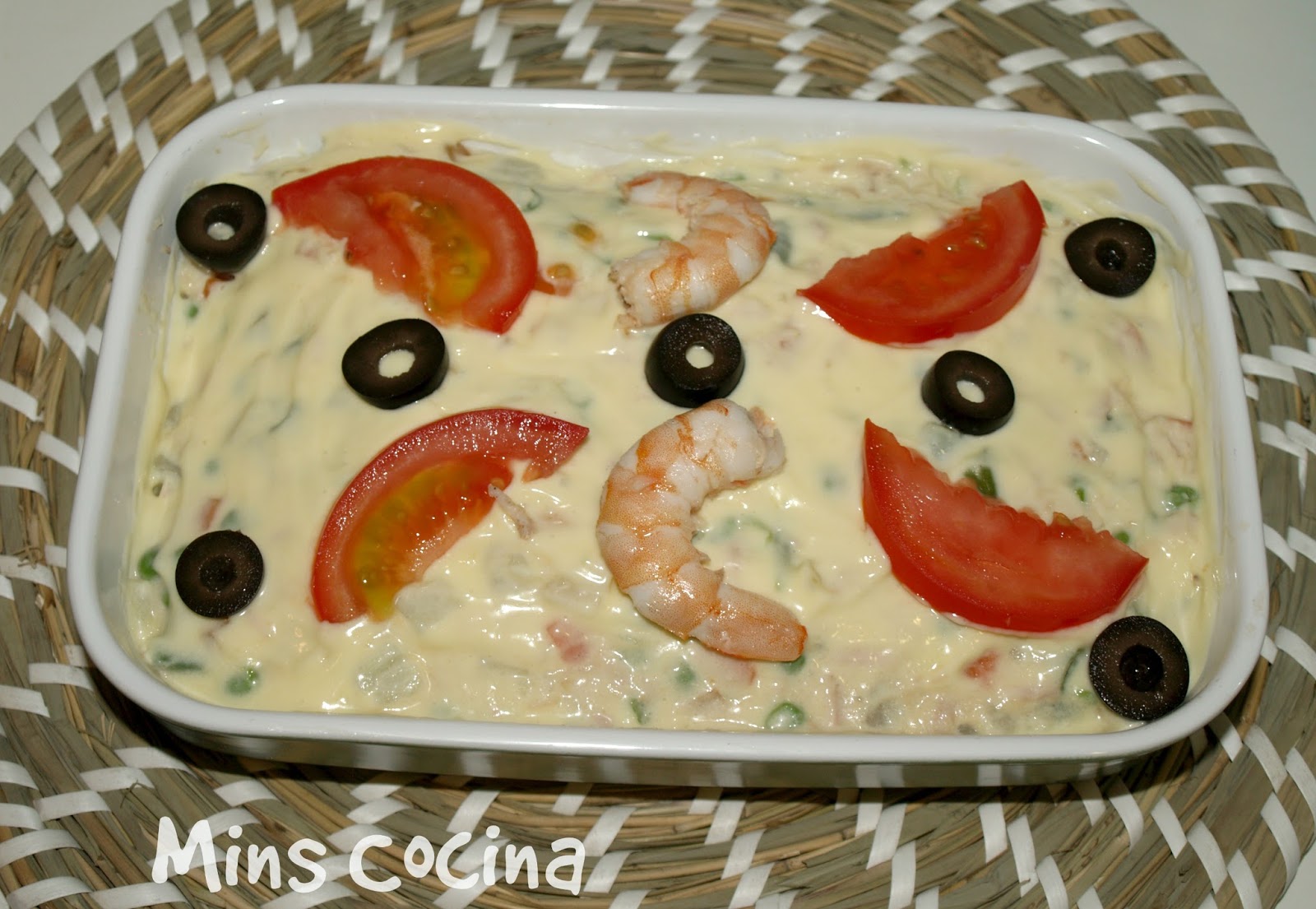 - Colocamos en una fuente o plato y añadimos un poco más de mayonesa por encima. Ahora solo falta decorar: yo puse un poco de tomate, unos langostinos y aceitunas negras. También queda muy bien el huevo duro. Esta ensaladilla admite muchas variantes: podéis incorporar el tomate o el huevo a la mezcla de verduras y queda muy bien también, en lugar o además del atún. O solo dejar las verduras si la queréis más ligera, como aperitivo... Queda estupenda y como veis se hace en nada de tiempo. Ideal para este verano caluroso que tenemos. No os la perdáis!