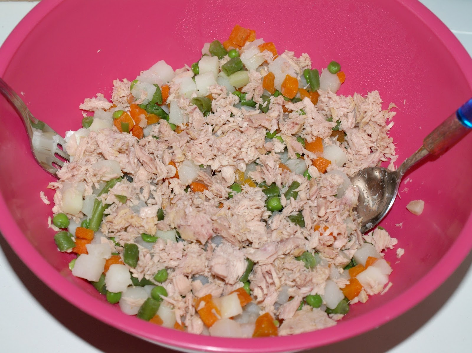 - Cuando la verdura haya enfriado, añadimos el atún y si nos gusta también aceitunas verdes troceadas. Yo esta vez no tenía y no las eché. La verdad es que queda muy rica de las dos formas: con y sin.
