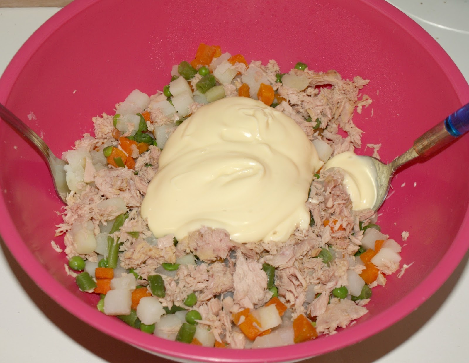 - A continuación añadimos la mayonesa y mezclamos todo muy bien para que homogéneamente repartida.