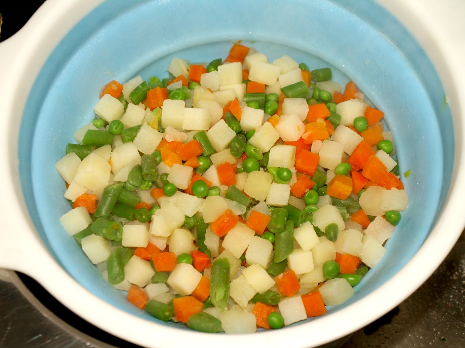 - Por supuesto, esta receta se puede hacer preparando la mezcla de verduras uno mismo, pero si lo que queremos es una receta rápida y sencilla, y que queda fantástica, yo me quedo con la ensaladilla congelada. Ponemos a hervir agua con un poco de sal en una cacerola y cocemos la verdura unos 7- 10 minutos, hasta que esté tierna. La colamos y dejamos enfriar.