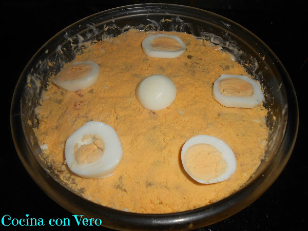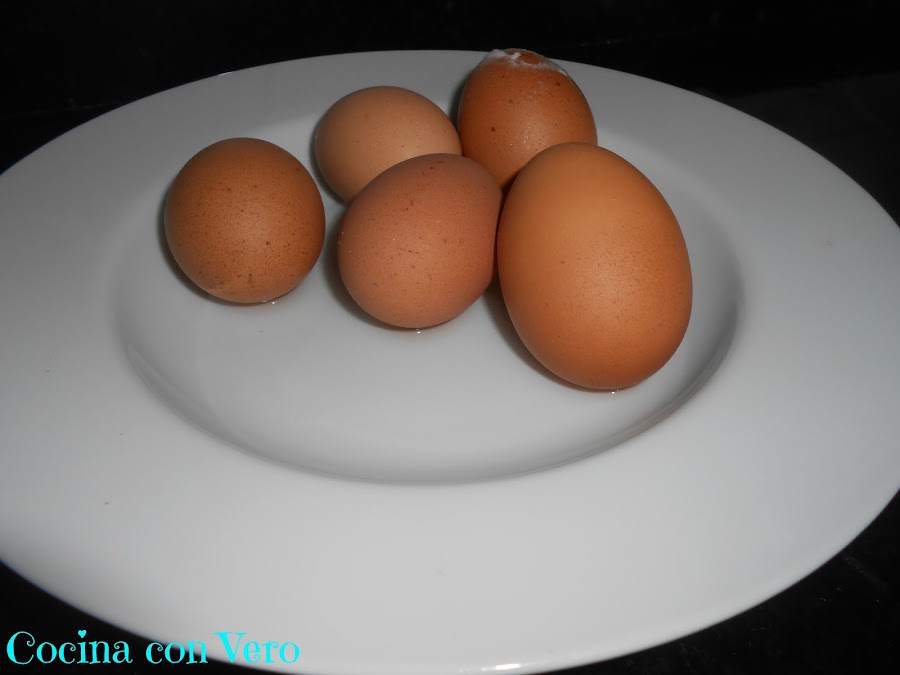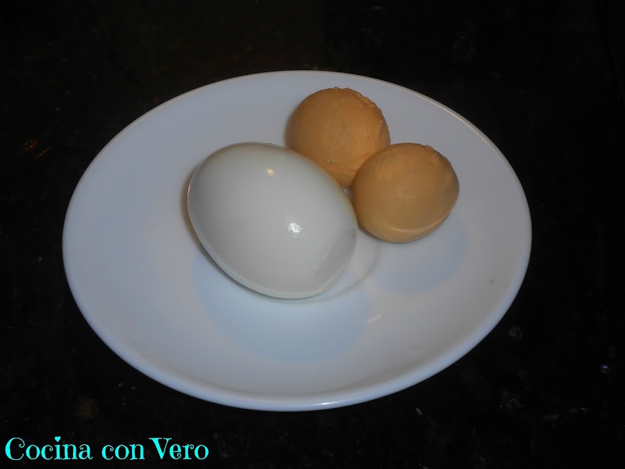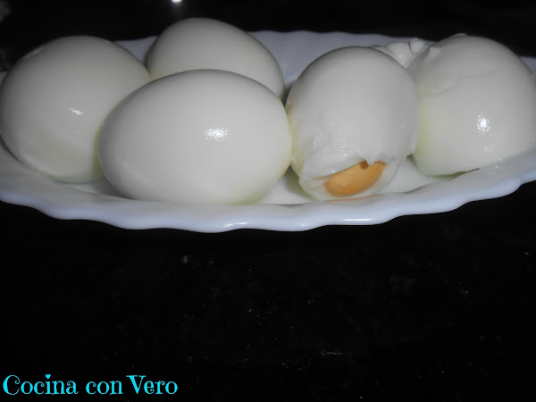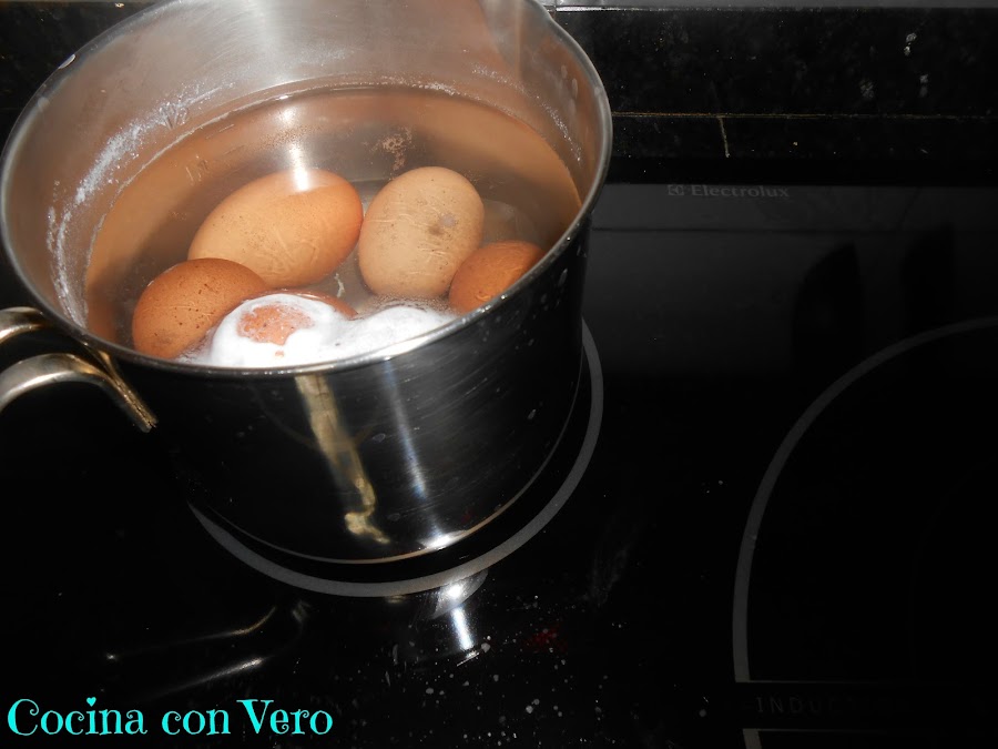 1/ En un cazo se ponen los huevos, se cubren de agua fría echándole un puñado de sal. Lo dejamos que hierva y contamos 10 min. Pasado ese tiempo lo apartamos del fuego y lo dejamos enfriar. Una vez frío pelamos los huevos y los reservamos.