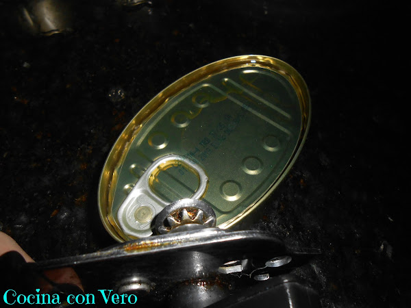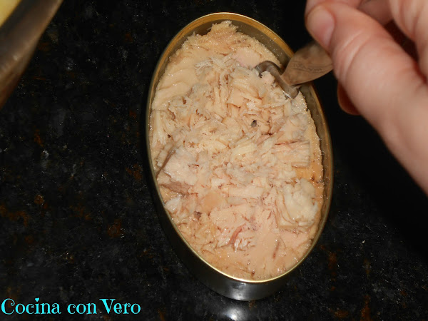 6/ Abrimos la lata de bonito con el abrelatas y escurrimos muy bien el aceite del bonito pasándolo a un tarro de cristal para luego reciclarlo, lo añadimos al bol desmenuzándolo un poco con las manos.