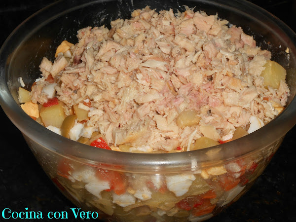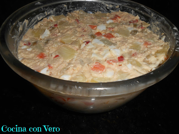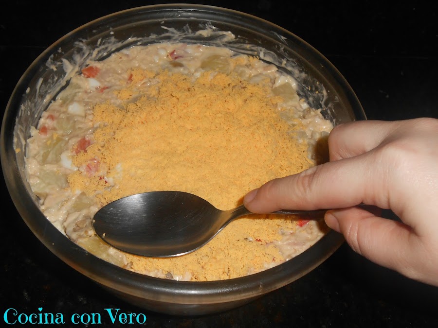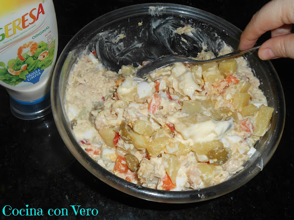 7/ Echamos la mahonesa, revolviendo todo a gusto de cada uno, dependiendo de como nos guste de jugoso ponemos más o menos mahonesa.