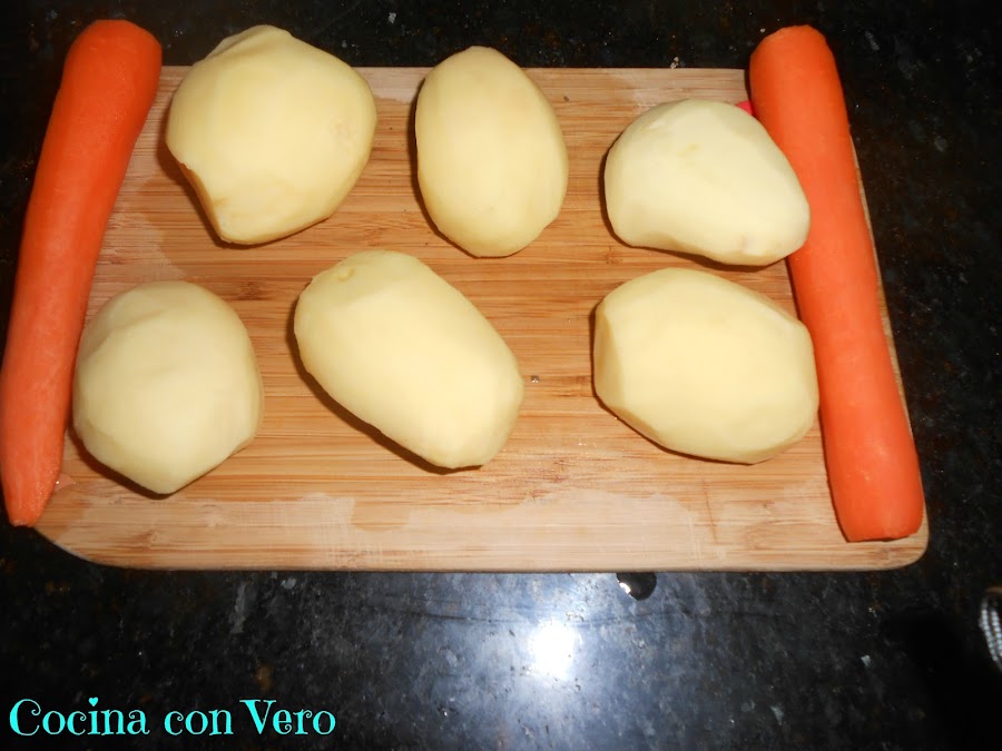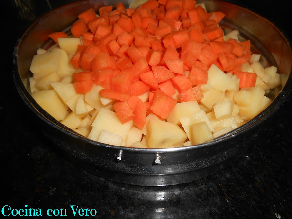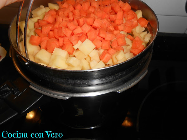 3/ A continuación, en el cestillo de la olla se echan las patatas y las zanahorias.Se deja hervir el agua con un puñado de sal en el fondo de la olla. Cuando hierva introducimos el cestillo en la olla y lo tapamos, si vemos que aun no subió la válvula de la olla abrimos y cerramos las veces que sean necesarias hasta que suba.