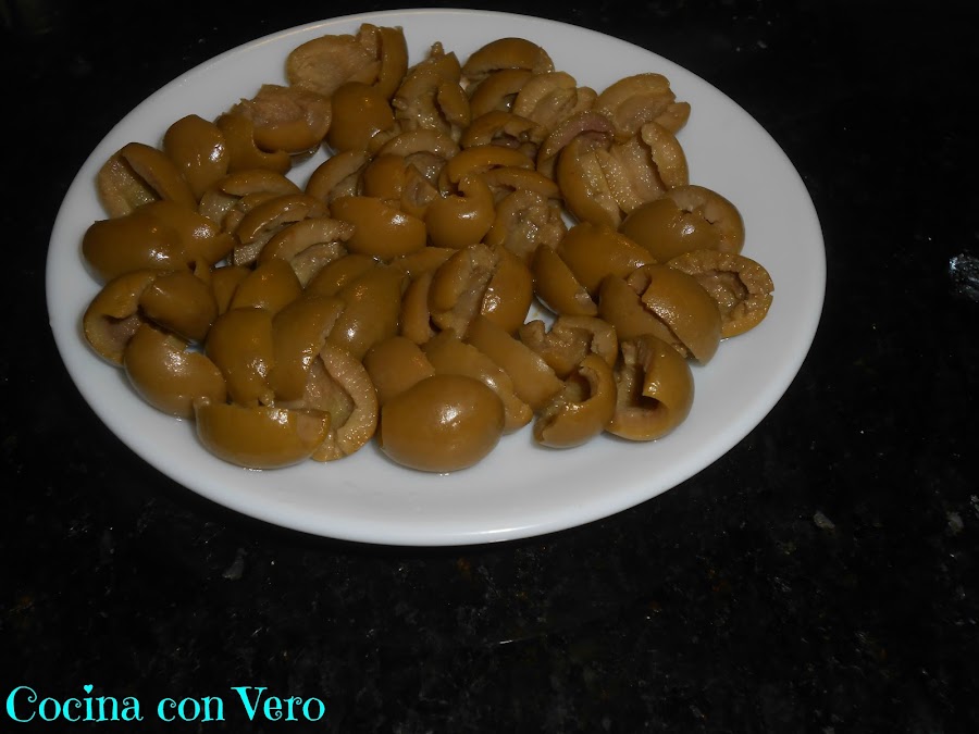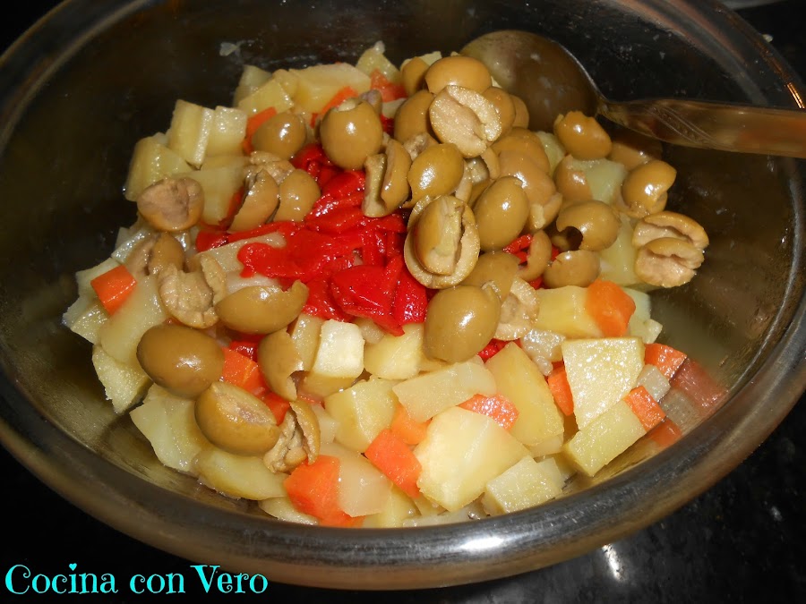 Cortamos las aceitunas a la mitad y las echamos al bol. También se pueden dejar enteras. Mezclamos todo muy bien.
