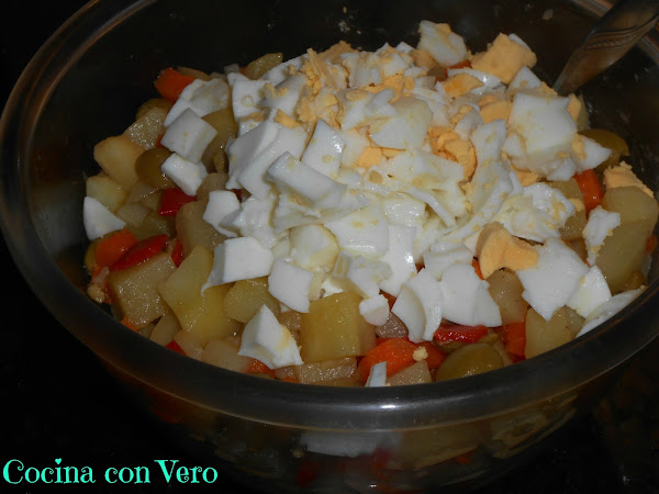 5/ De los 5 huevos reservamos 2 yemas y 1 huevo entero para adornar por encima de la ensaladilla, lo demás lo troceamos todo y lo pasamos al bol. Mezclamos.
