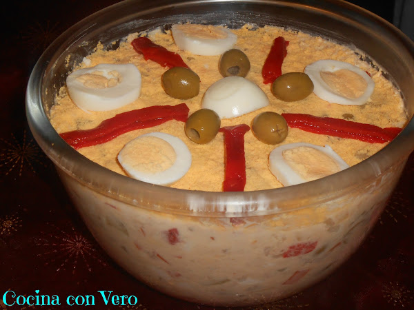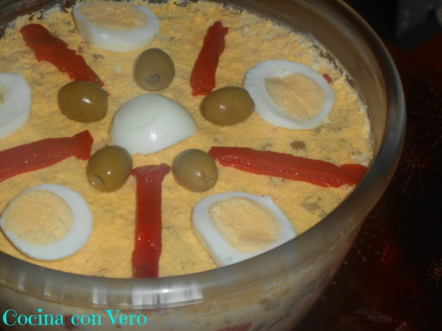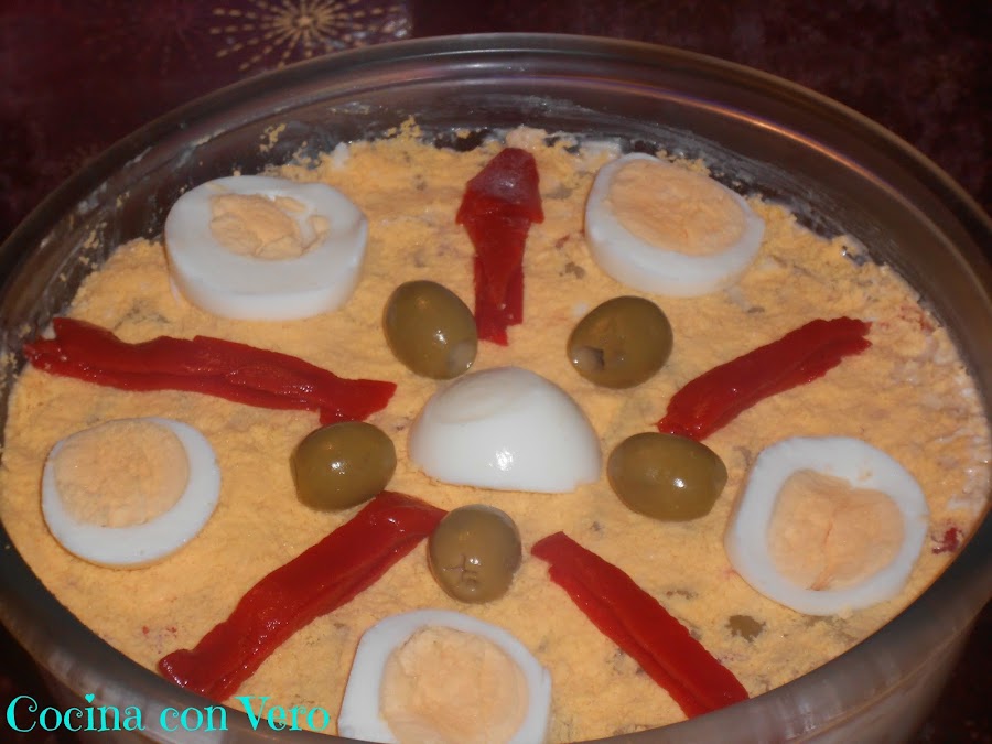 11/ Finalmente por encima de ella se le añade un pimiento en tiras alargadas, es decir, el que teníamos a parte y unas aceitunas para decorar. La cubrimos con papel film transparente y la guardamos en la nevera. Para presentarla cogemos el sacabolas de helado y nos quedará con una forma redondeada.