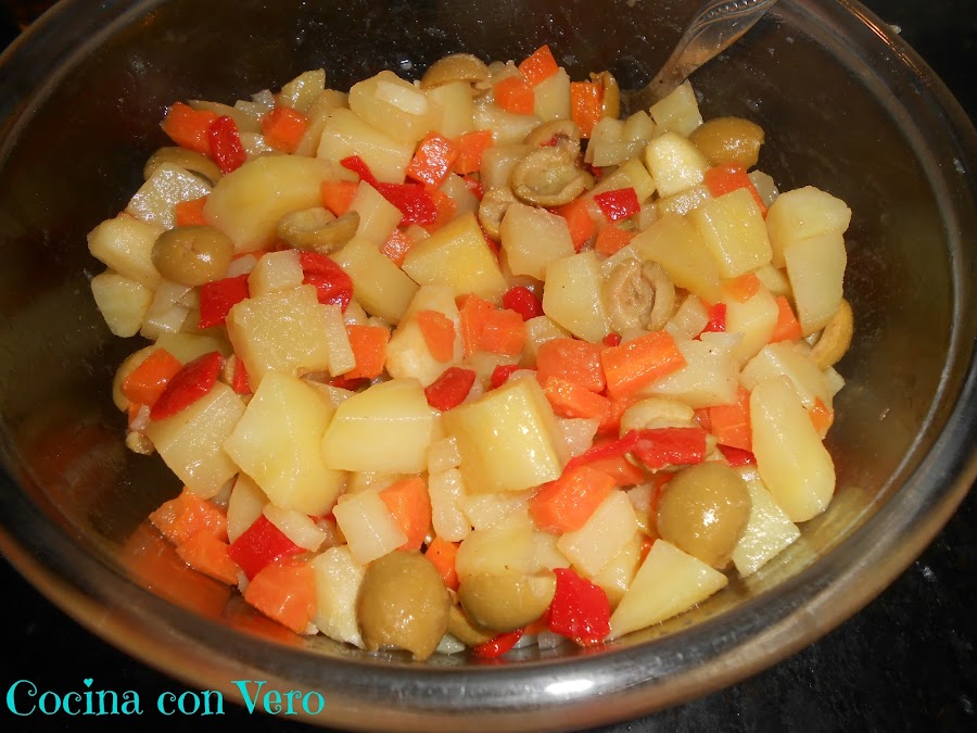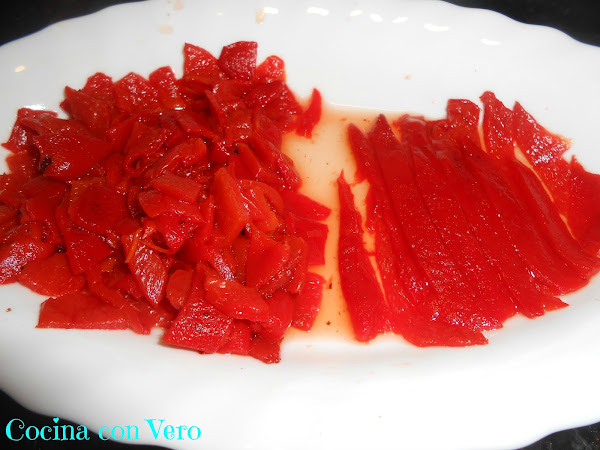 4/ Cortamos los 3 pimientos rojos del piquillo en cuadraditos dejando 1 de ellos a parte cortado en tiras alargadas para luego decorar la ensaladilla al final por encima y lo incluimos al bol revolviéndolo nuevamente.