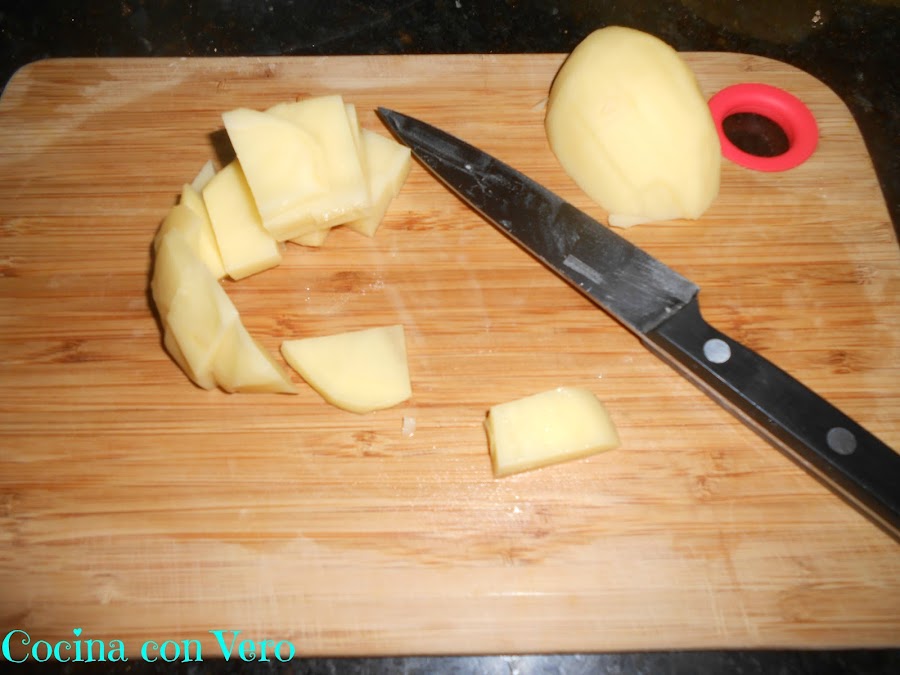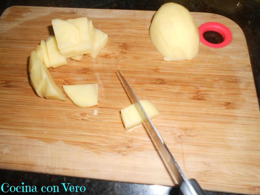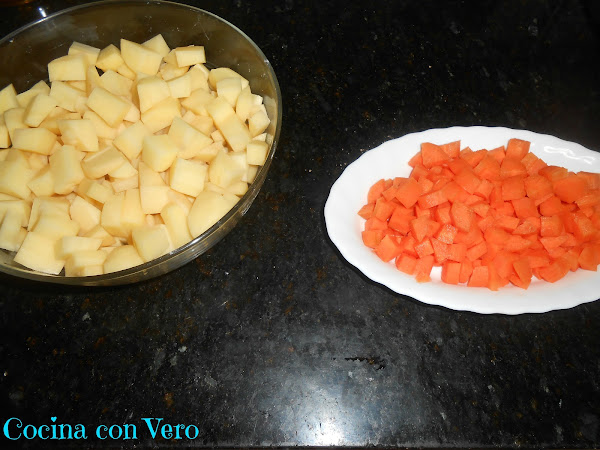 2/ Se pelan las patatas y las zanahorias, se lavan y se cortan en cuadraditos.