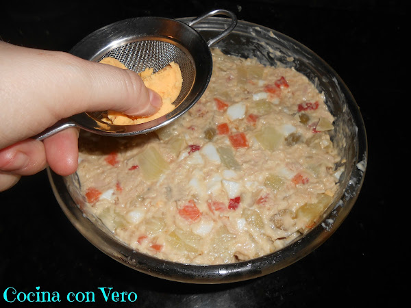 9/ En un colador introducimos una yema y con el dedo lo vamos aplastando. Hacemos lo mismo con la otra yema. Lo extendemos por toda la ensaladilla con ayuda de una cuchara.