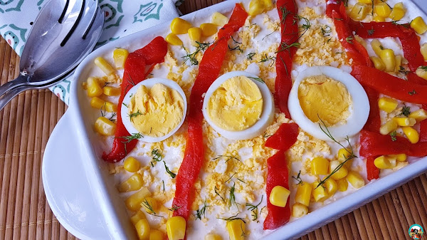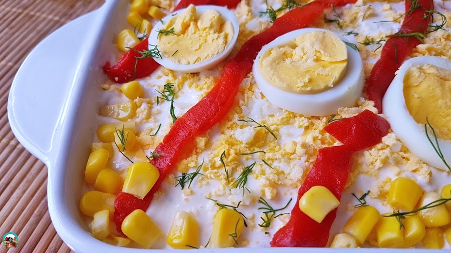 3.- Ponemos la ensaladilla en un bol o ensaladera. Rallamos un huevo por encima. Cortamos el otro huevo en rodajas. Decoramos la ensaladilla con unas lonchas de pimiento, las rodajas de huevo duro, un poco de maíz y esparcimos por encima un poco de eneldo fresco. La guardamos en la nevera hasta el momento de servir.