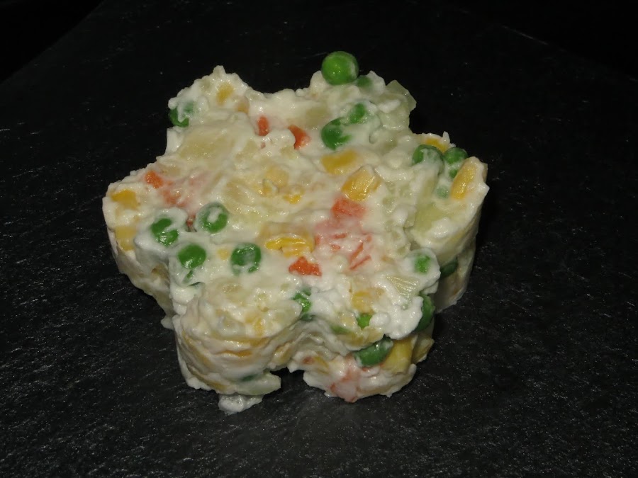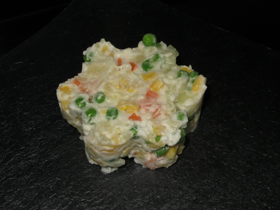 Ahora pelamos las patatas y la zanahoria y cortamos en trozos pequeños, añadimos los guisantes, la cebolla cortada, el maíz y veganesa al gusto y ya está lista para comer. También podéis añadirle pimientos verdes o rojos o algún tipo de encurtido como el pepinillo.