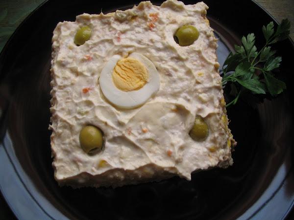 INGREDIENTES: una lata pequeña de maíz, un paquete de aceitunas sin hueso, 500 gramos de papas, 2 zanahorias medianas o 1 grande, 100 gramos de judías verdes, 1 bote de guisantes o 100 gramos congelados (si hay suerte, frescos), 1 huevo duro para decorar, 1 cebolleta (preferiblemente) o media cebolla (opcional, prescindir si no gusta), 1 lata de caballas en aceite de oliva como acompañamiento (esto es opcional y al gusto), pimiento morrón para decorar (antes de la enfermedad usaba una lata picada en la ensaladilla y guardaba unos trozos para la decoración. Les aseguro que da un toque riquísimo. Si pueden comerlo, pruébenlo). Salsa mayonesa, yo usé lactonesa de soja. Agua y sal.ELABORACIÓN TRADICIONAL: ponemos las zanahorias peladas en trozos grandes y las papas también partidas (limpias y con piel) al fuego en un recipiente con agua fría, bien cubiertas (para aminorar el tiempo, podemos hacerlas en olla a presión). Cuando se produzca el primer hervor, lo bajaremos a suave. Pela las zanahorias y añádelas. Hacer durante 25 minutos. Añadir los guisante (si son frescos o congelados, si son de lata, simplemente escurrirla y reservarla) y continuar unos 5 minutos más tras incorporar la sal. Mientras, cocer en otro recipiente el huevo durante 10 minutos con agua y sal. Escurrir el agua y esperar a que se atempere todo. Pelar las papas y el huevo. Picar las zanahorias y las papas en dados y el huevo en circulos para decorar. Corta las zanahorias en 4 cuartos a lo largo. Corta las aceitunas finamente y reservar unas cuantas para decorar. A mí, particularmente, me gusta picar un poco las habichuelas o judías verdes para que queden más pequeñas. A quien le agrade, puede escachar un poco la papa. La cebolleta o 1/2 cebolla la picamos muy bien. Cortar el pimiento morrón en tiras para decorar (yo no lo utilicé por lo que ya expliqué). Abrir la lata de maíz dulce y escurrir bien. Mezclamos todo en un bol. Elaborar la sojanesa, la receta la pueden ver aquí. No pongan las hierbas y obtendrán la mayonesa de soja base. Incorporar la salsa al bol y mezclar de nuevo para que quede todo bien impregnado. Espero que esta ensaladilla sea de vuestro agrado. Por cierto, lo que es la cocción de las verduras la podemos hacer en la Thermomix, unos 20 minutos, velocidad 2 y temperatura varoma en el cestillo. Y continuaremos otros 5" tras añadir los guisantes.