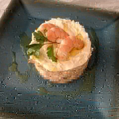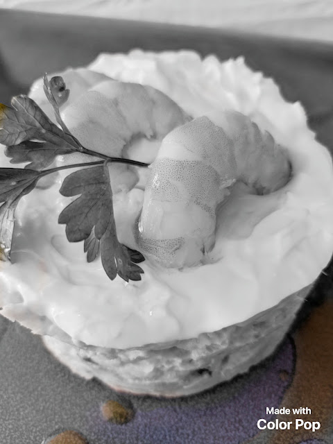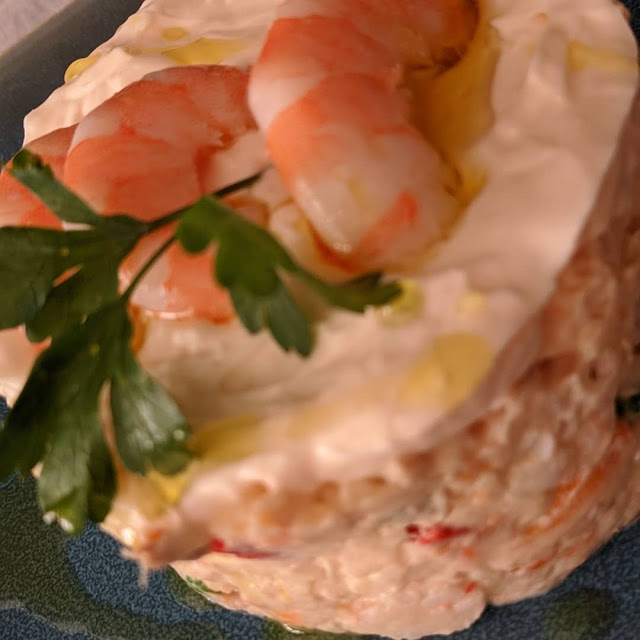 Rallar tambien los huevos. Añadir los guisantes y los langostinos pelados y cortados en trocitos.