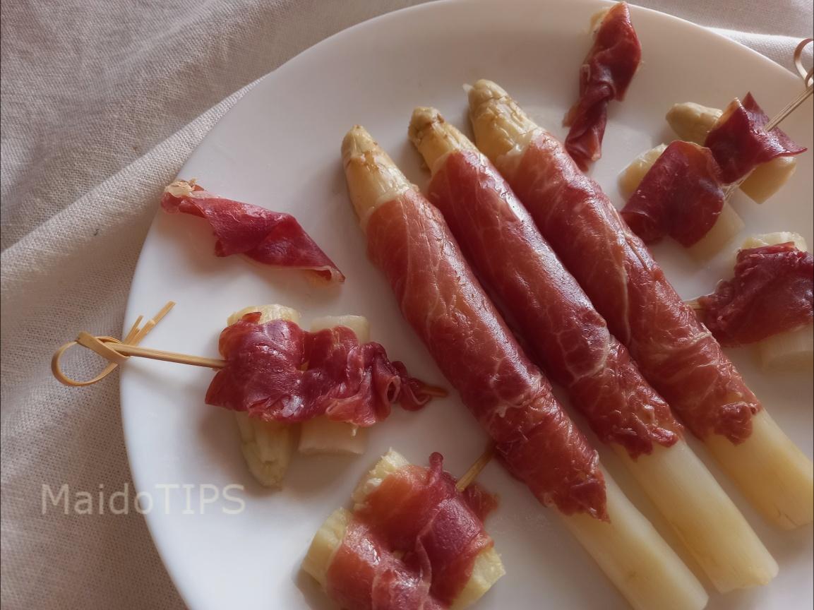 Sacar los espárragos del envase y enrrollar tres de ellos sobre una loncha de jamón que sobresalga la parte de la yema e ir colocándolos en el plato. Para las mini brochetas corto cada espárrago en tres trozos, corto una tira de la loncha de jamón de largo y con el palito de la mini brocheta voy insertando, primero el jamón, seguido del espárrago así hasta dos o tres por brocheta, colocándolos en el lateral del plato y ya para decorar colocar un poco de mayonesa, jamón cortado y esparcir un poco de orégano y unas gotas de aceite de oliva virgen extra. Si los prefiero de aperitivo o cocktel una vez hechas las mini brochetas las voy colocando en diferentes cuencos o platitos, repartidos por toda la mesa donde además de quedar muy vistosos y bonitos, os aseguro que vuelan!