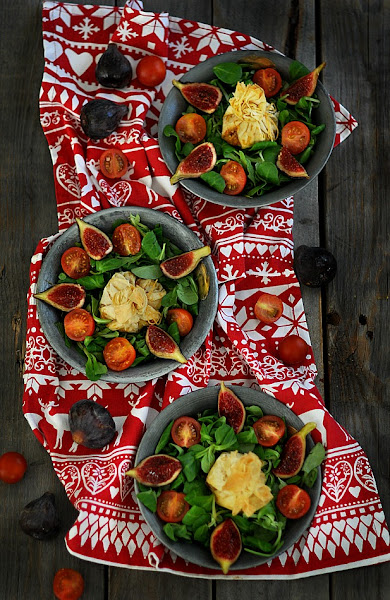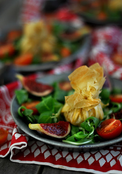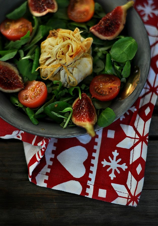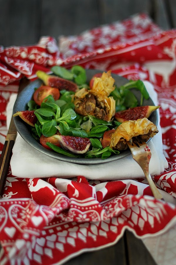 - Prepare una fuente o platos donde va emplatar, con ensalada verde de vuestra preferencia. Tomate cherry e higo morados. Coloque un poco de salsa del rabo de toro y encima ponga el paquetito. Repita la misma acción para el resto de platos.