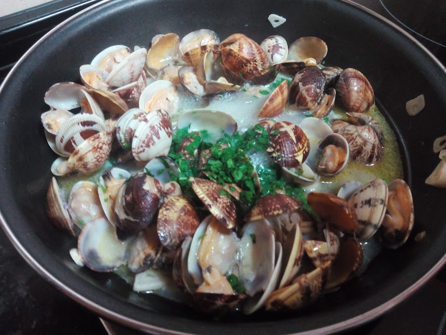 Añadimos las almejas y mantenemos a fuego vivo durante unos dos minutos removiendo.