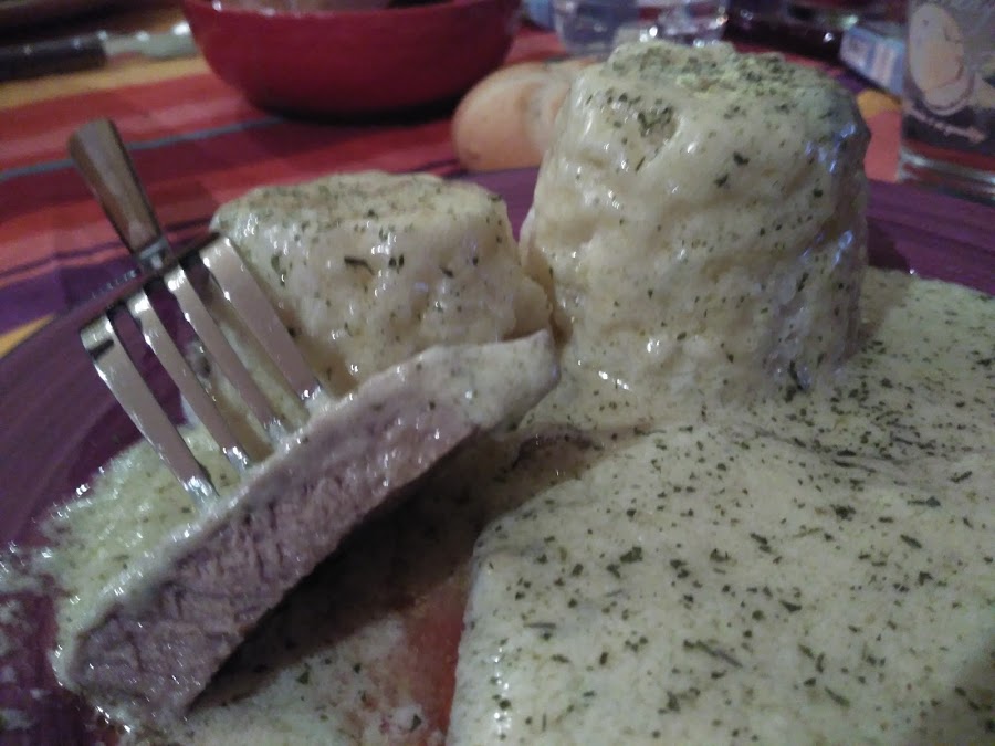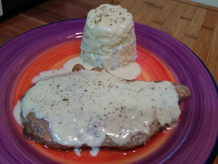 - Servimos los entrecot con la salsa por encima y un flan de arroz hervido, para rematar la salsa....mmmmhhhhhh