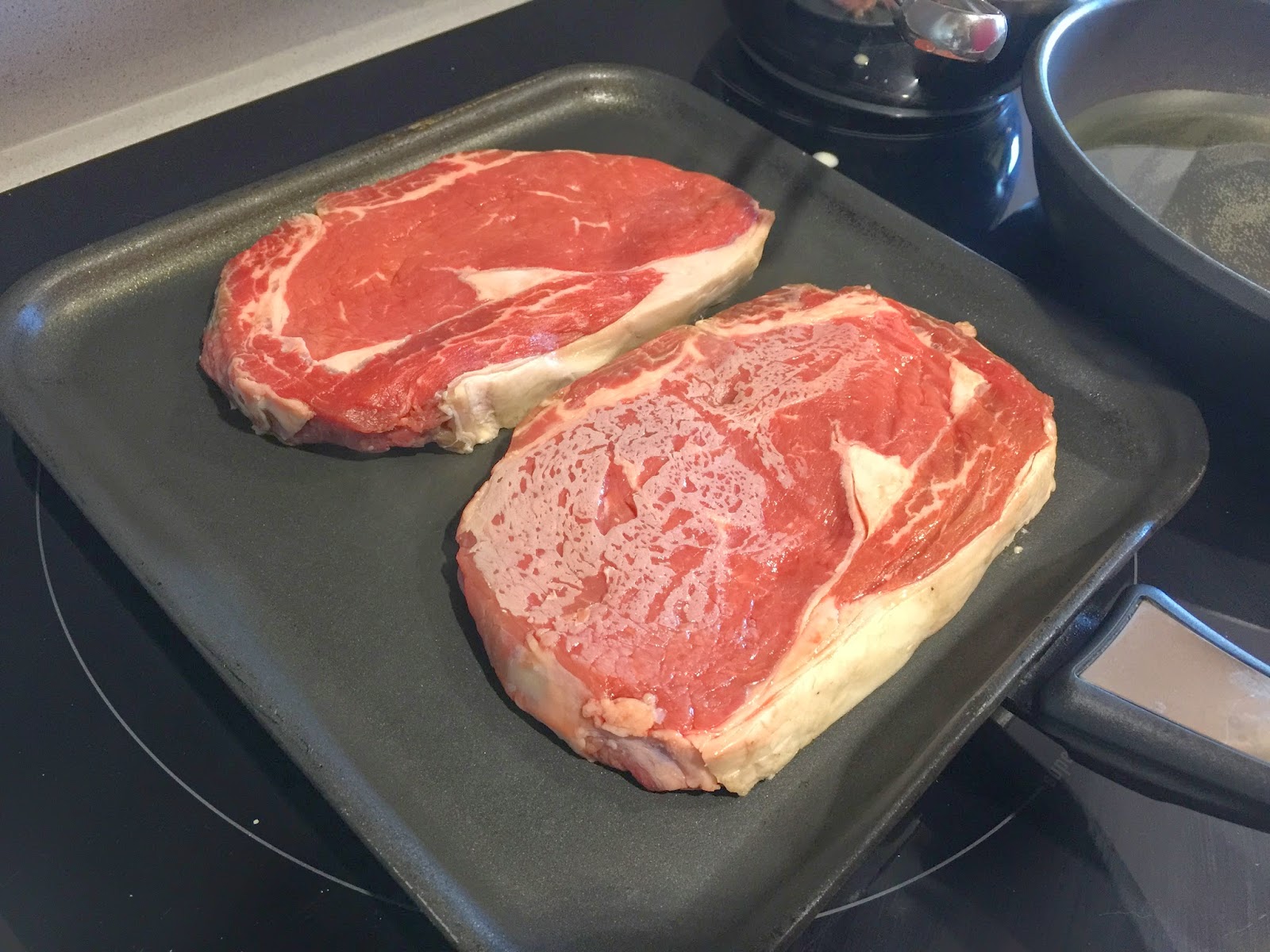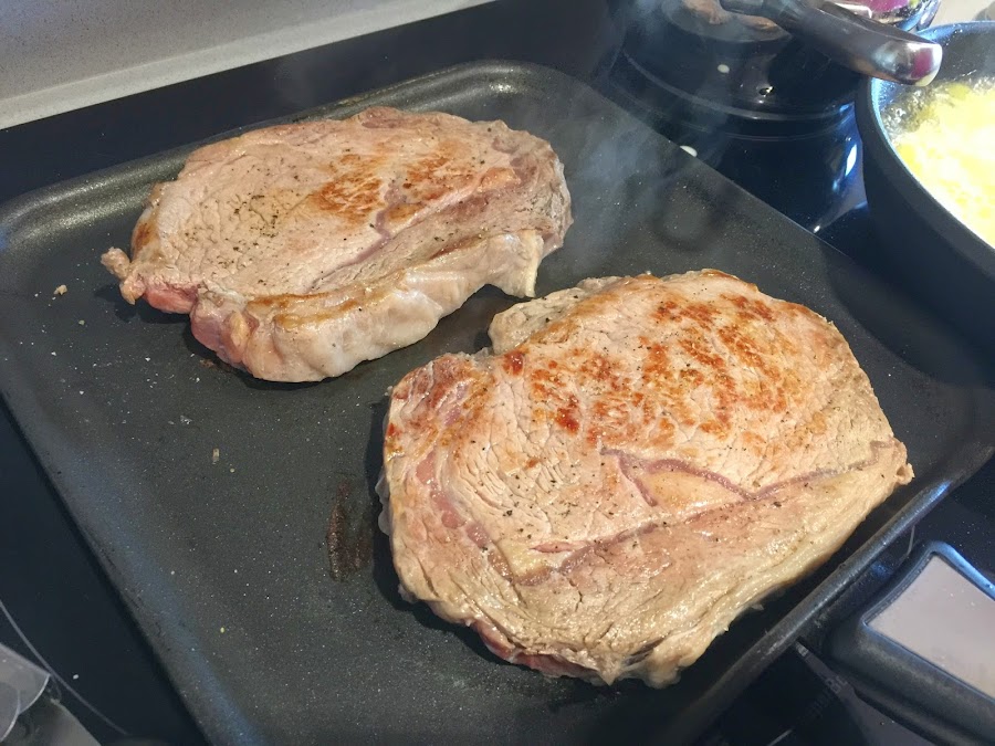 5. A fuego fuerte ponemos la carne en la plancha. Salpimimentamos al gusto y hacemos hasta conseguir el punto que nos gusta. En casa nos gusta que quede al punto pero que no sangre, así que lo hemos tenido uno 8-9 minutos a fuego medio-alto.