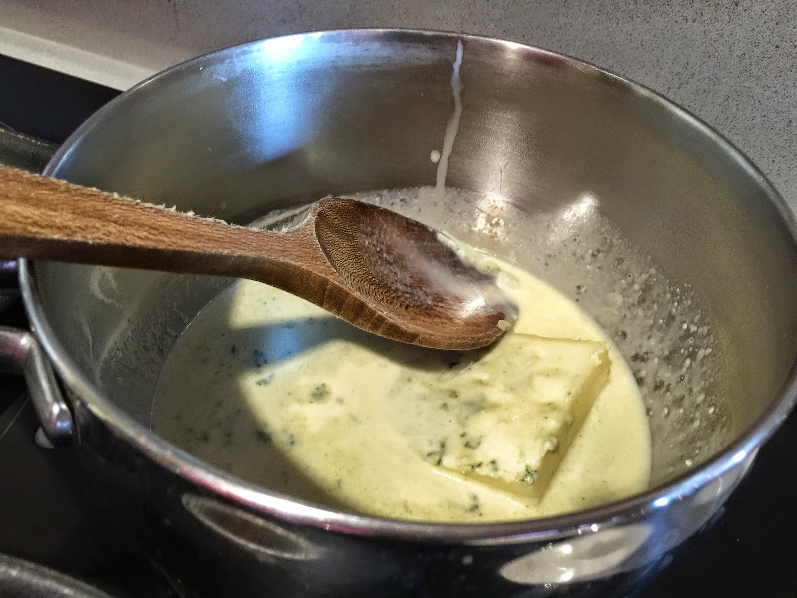 1. Empezamos preparando la salsa de queso. Ponemos el queso en una ollita a fuego medio, cuando empiece a fundirse añadimos poco a poco la leche evaporada. Cuando esté bien integrado todo dejamos a fuego bajo durante 5 minutos. Dejamos que temple y vamos haciendo el resto. La salsa la sirvo a parte que cada uno pueda añadirse a su gusto. Sería una pena derramarla encima de la carne, porque ya no apreciaríamos su sabor.