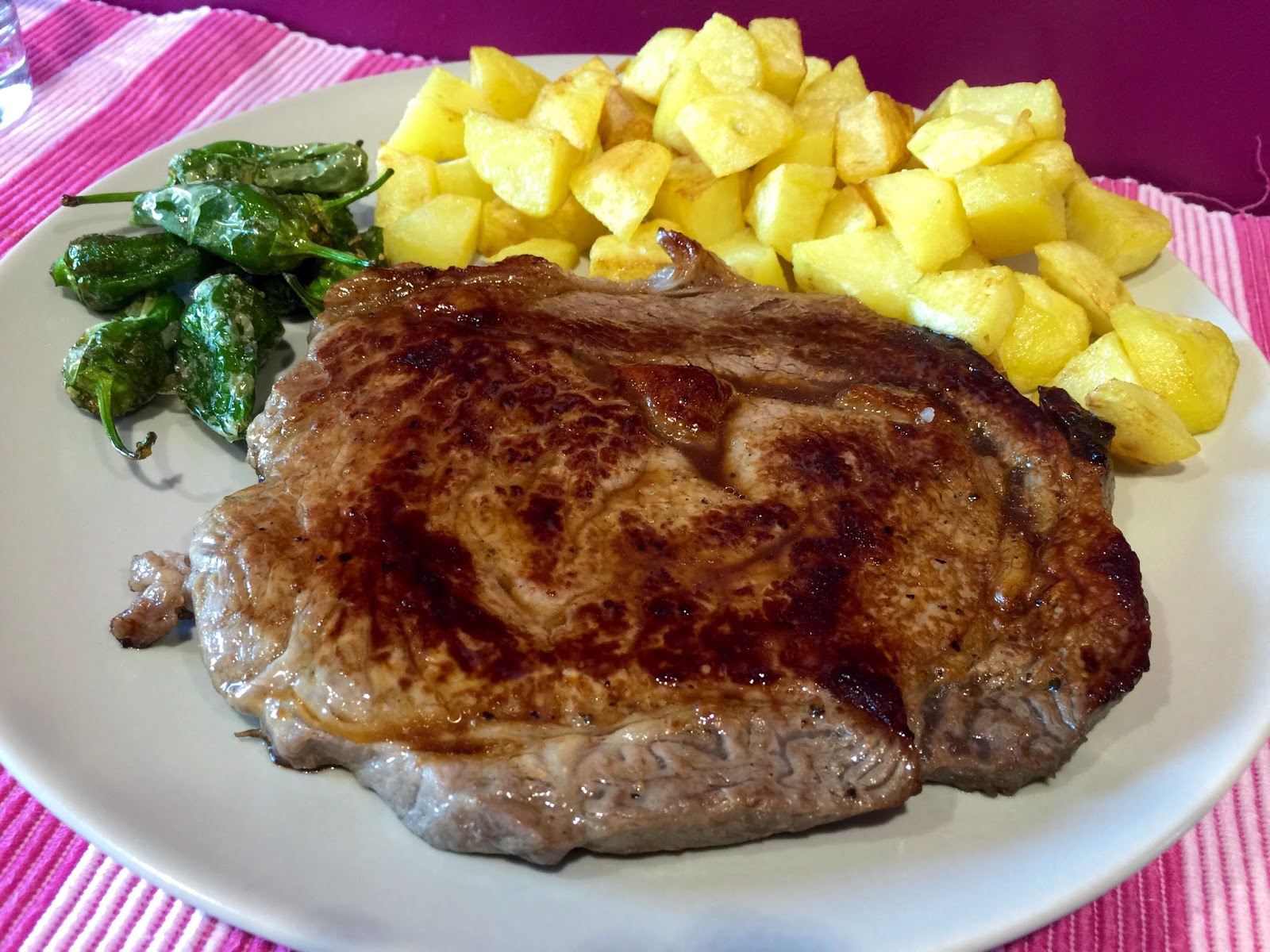2. Para que todo nos quede al punto y calentito hay que ir haciendo la carne, las patatas y los pimientos a la vez.