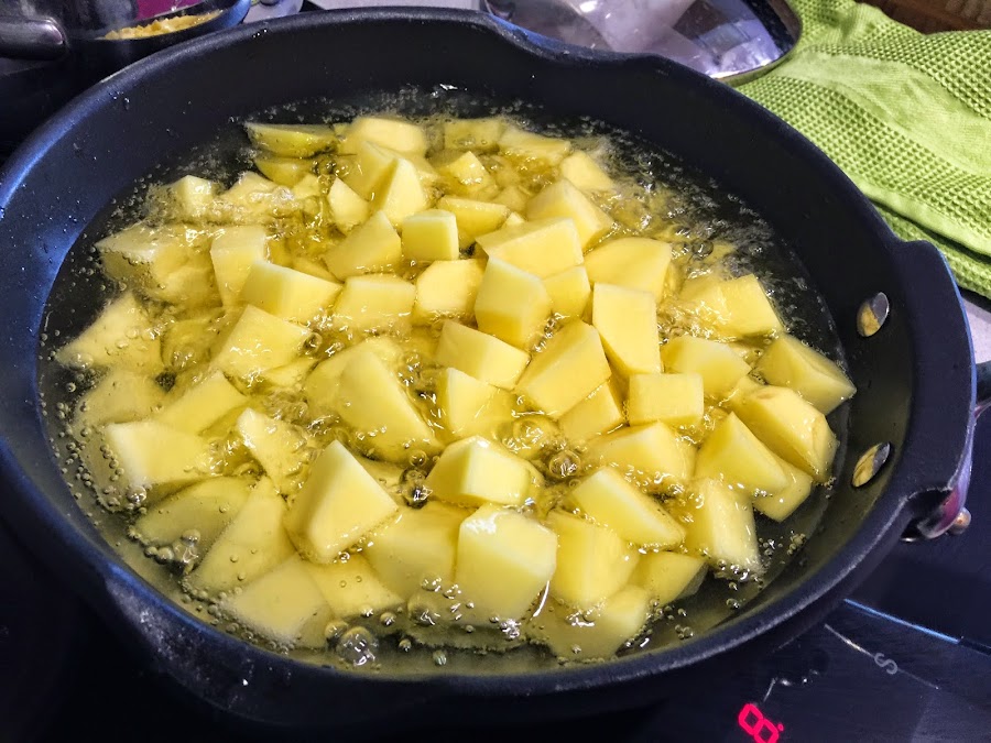 3. Pelamos, lavamos y cortamos las patatas a tacos. Freímos a fuego alto en aceite de girasol abundante. Cuando estén fritas las retiramos a un plato con papel absorbente y salamos.