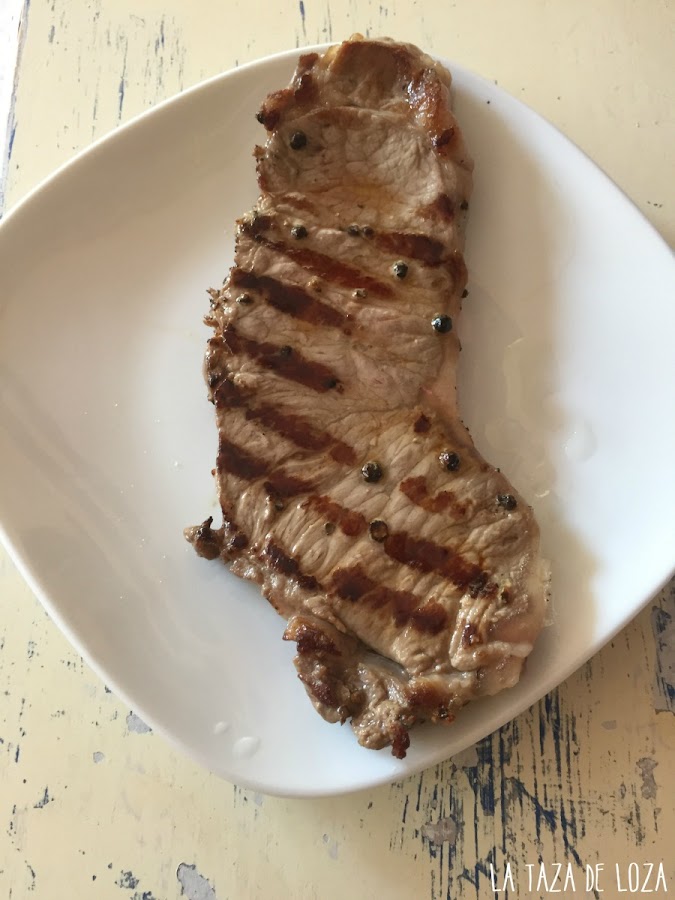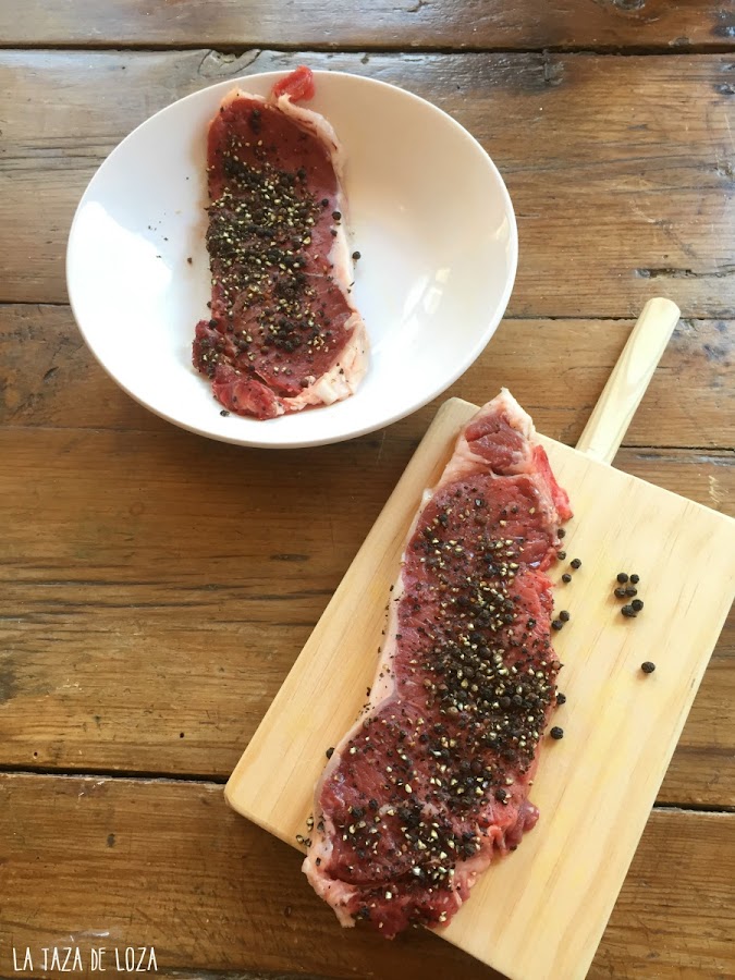 Empezamos. La carne que hayamos comprado y cortada del grosor que queramos se pone en un plato y se le echa la pimienta negra y blanca, o negra y verde machacada por nosotros o en un pimentero, recién molida y gruesa.