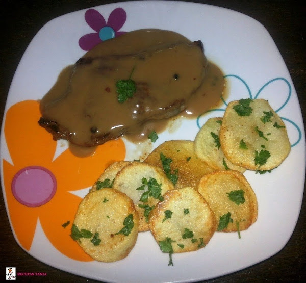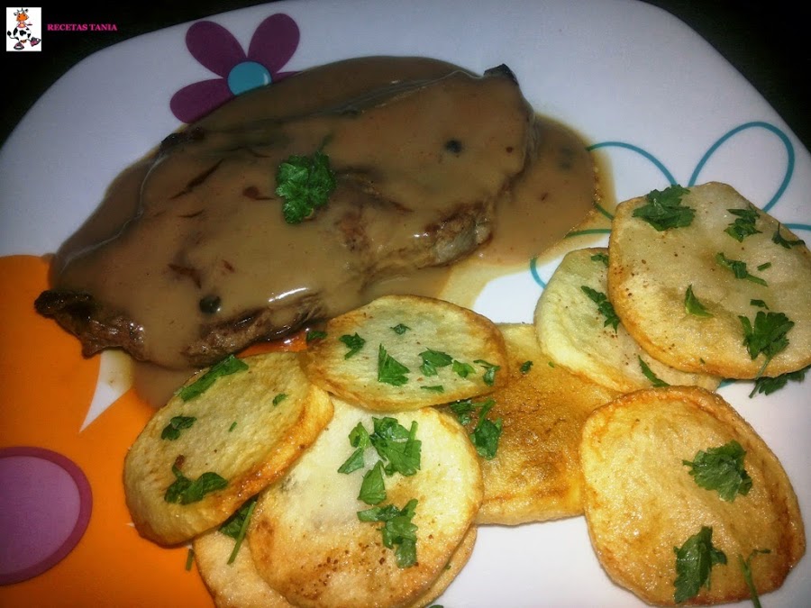 En un caldero ponemos agua y el medio sobre de rabo de buey,mezclamos bien con las varillas y ponemos al fuego,cuando empiece a hervir bajamos el fuego y añadimos las pimientas variadas (negra,rosa y blanca). Añadimos la nata (crema de leche) y vamos removiendo,cuando vuelve a hervir apagamos el fuego y dejamos reposar.Cortamos en rodajas las papas (patatas) y las freimos en una sarten con abundante aceite y reservamos. En una plancha hacemos el entrecot, en casa nos gusta bien echo (pero eso ya es al gusto). En un plato ponemos el entrecot y ponemos la salsa de pimienta por encima,colocamos las papas (patatas) y ponemos un poquito de sal y espolvoreamos perejil fresco.